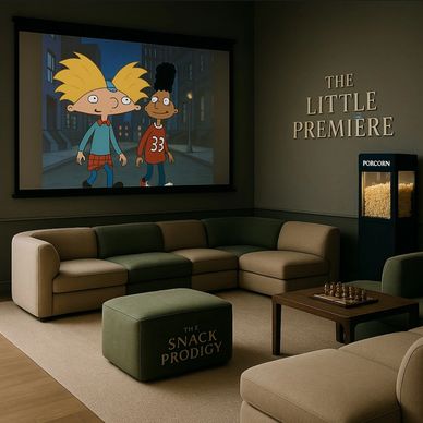 A mini-cinema corner featuring a projector screen, popcorn vending, and classic kid-friendly cartoons, transforming travel wait time into a cozy movie moment.